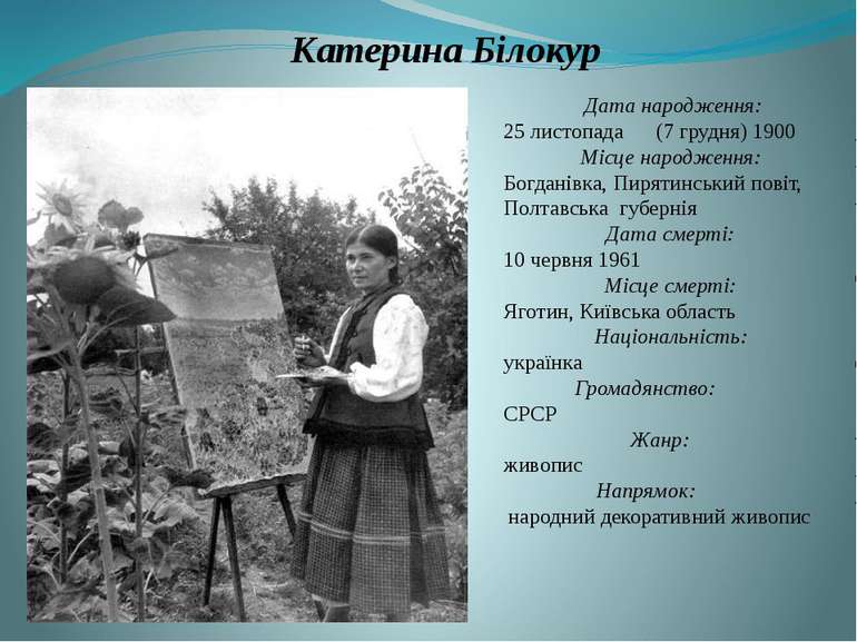 Ім'я Катерини Білокур, самобутньої художниці з народу, яка в своїх чудових полотнах втілила невмирущу красу живописної української природи, назавжди вписалося в історію народного мистецтва.