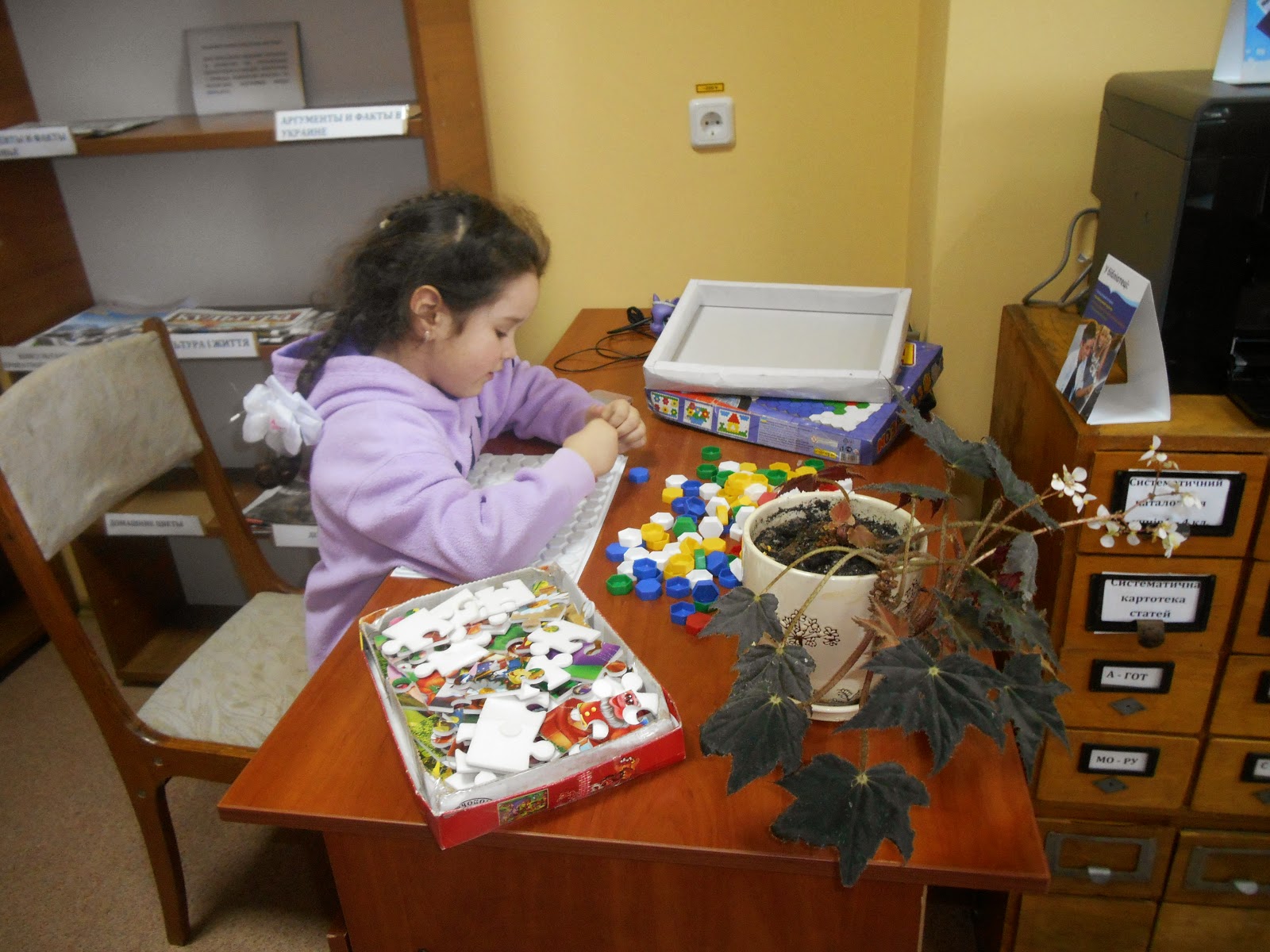 Маленька читачка бібліотеки Софійка Бен – Мухамедова чекає поки дідусь поспілкується з рідними по Скайпу