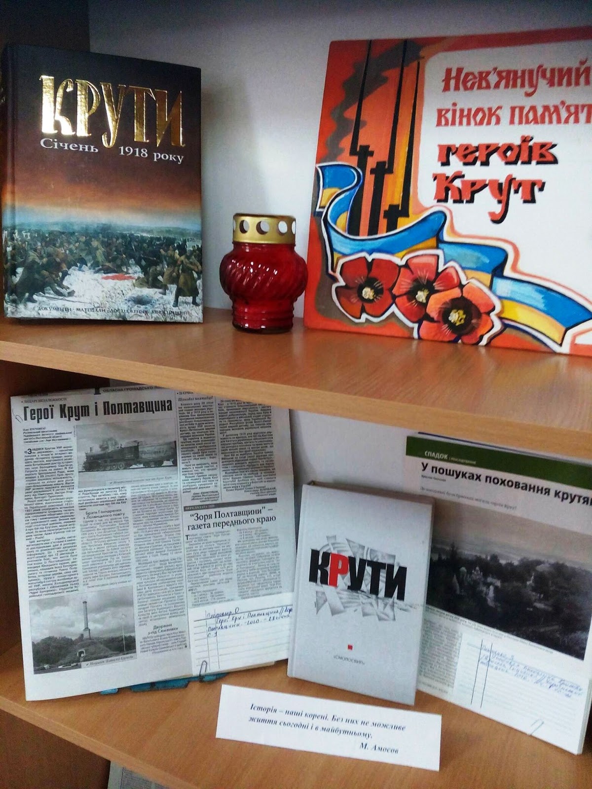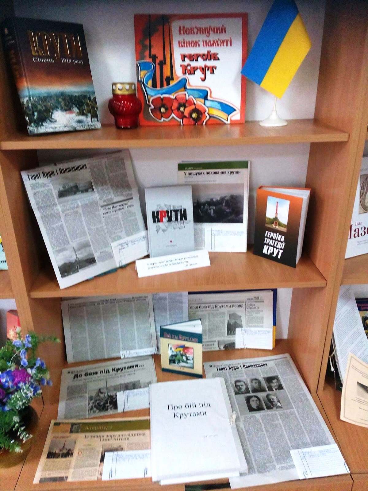 Про трагедію під Крутами багато написано - статей, монографій, дослідницьких робіт, видані цікаві книжки… І звичайно, в нашій бібліотеці відвідувачам ми можемо запропонувати різноманітний матеріал –публіцистику, художні твори і періодичні видання щодо цієї трагедії.