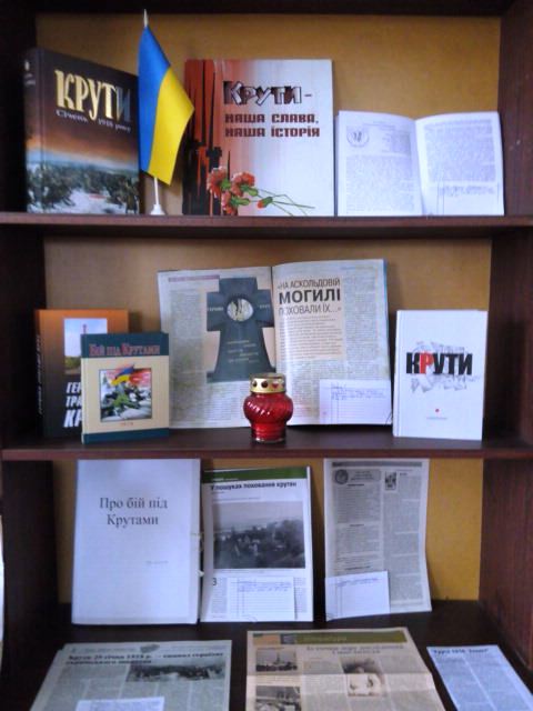 Як юні сини, що життя віддали Під Крутами всі як Герої…», провідний бібліотекар Людмила Ігольніцина розповіла присутнім, що цей бій тривав майже п’ять годин поспіль між чотирьох тисячною більшовицькою армією Михайла Муравйова та загоном з київських студентів і бійців вільного козацтва, який загалом нараховував лише чотири сотні вояків. У перебігу військових дій цей бій якогось вирішального значення не мав, та у свідомості багатьох українців особливого значення набув завдяки героїзму української молоді. Розповідь, супроводжувалася демонстрацією фотоматеріалів із Інтернету, фонограмами пісень даної тематики та знайомством з книгами, що висвітлюють цю подію, які були представлені на тематичній викладці літератури «Крути – наша слава, наша історія»