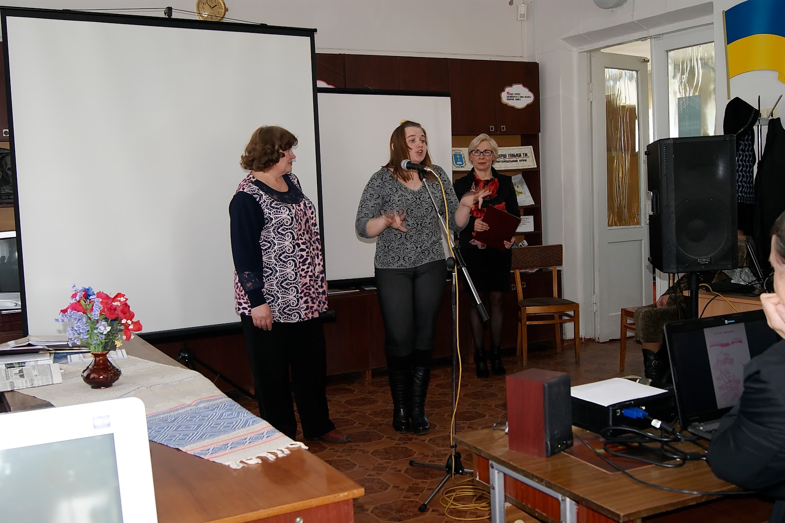 Справжнім відкриттям для молодих користувачів центральної районної бібліотеки став виступ учениці Миргородської спеціальної школи-інтернату для дітей зі зниженим слухом Жанни Омелич під час зустрічі з поетесою Наталею Харасайло. Жанна погано чує, майже не розмовляє. Але – декламує вірші і навіть співає! Це відбувається так: звучить пісня, а дівчина виконує її руками, поглядом та точним відтворенням губами. Музика - лише фон. Емоційність, міміка, рухи – на першому місці. Вона повністю занурюється в тему.