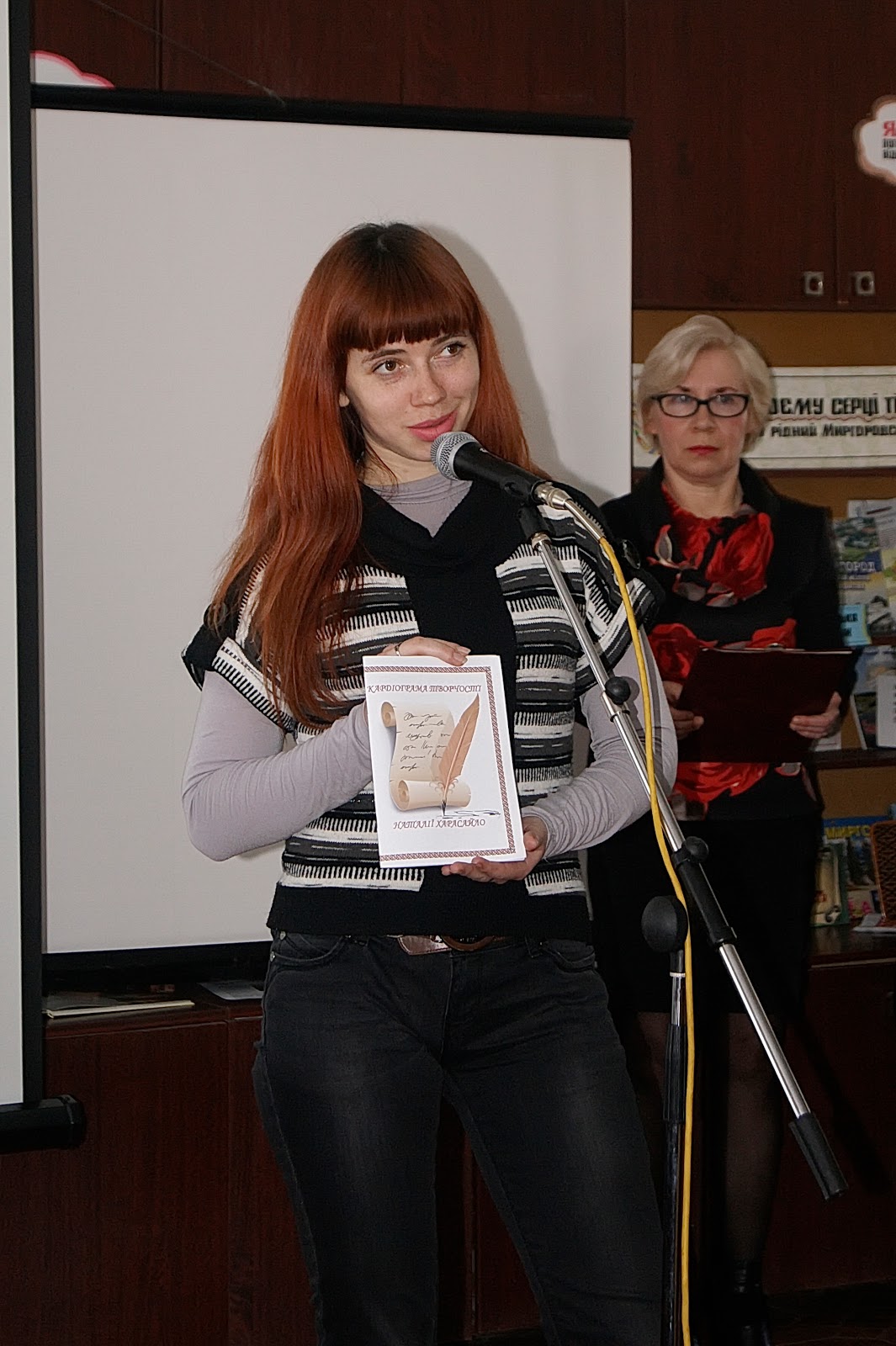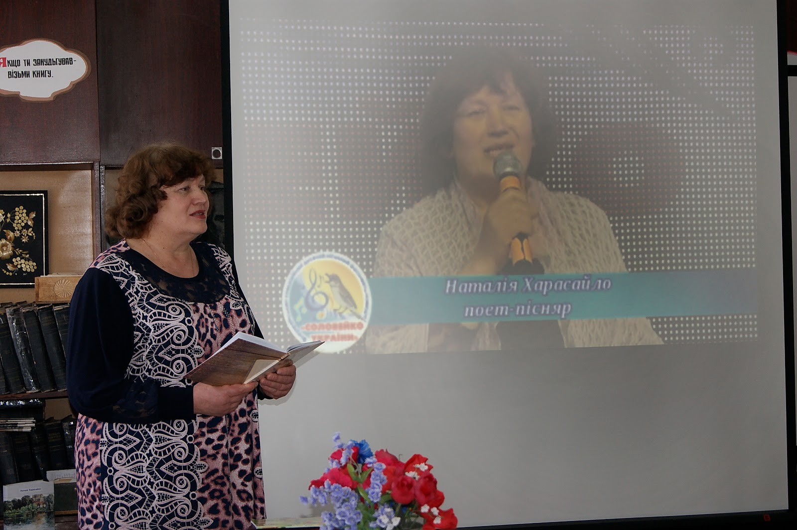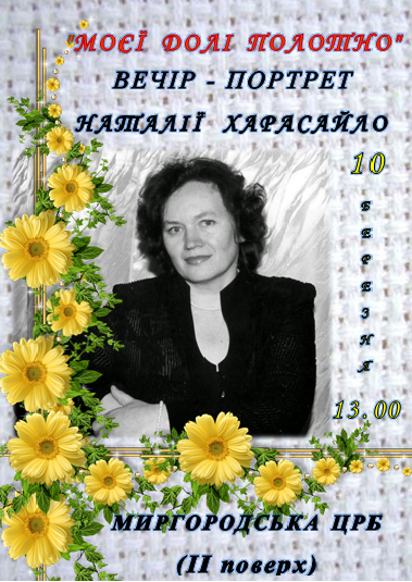 Ніжним доторком весняного подиху огорнув відвідувачів Миргородської центральної районної бібліотеки захід, що відбувся 10 березня 2016 р. У переповненій читальній залі книгозбірні на зустріч з прихильниками завітала Наталія Никифорівна Харасайло, Поетеса, член Національної Спілки журналістів України, член Національної Спілки письменників України та Полтавської Спілки літераторів, переможець Всеукраїнського радіо фестивалю сучасного романсу “Осіннє рандеву” Миргородського відкритого рейтингу популярності “Людина року” в номінації “Митець року”, лауреат літературно-мистецької премії ім. Антона Шевченка, ”, член журі всеукраїнського радіофестивалю ” Соловейко України”, лауреат обласної премії ім. Леоніда Бразова за книгу поезій “Два голоси для флейти.”