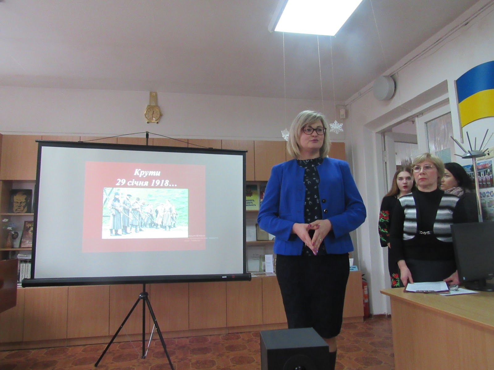 Працівники бібліотеки підготували викладку книг, публікацій з періодичних видань «Нев’янучий вінок пам’яті героїв Крут». Юнацтво з великим інтересом знайомилося з оновленими матеріалами.