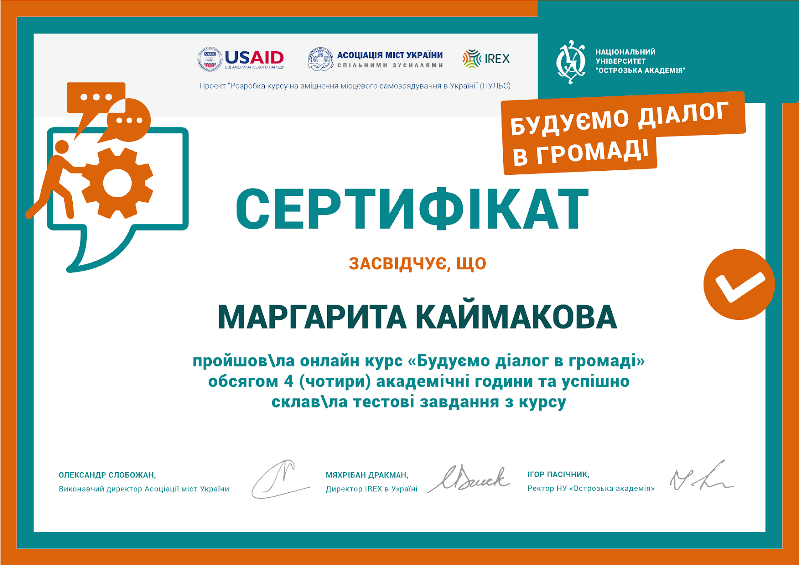 Зараз, в умовах децентралізації, дуже важливо зробити свою громаду успішною, згуртованою і конкурентноздатною. І саме на це спрямований відео курс «Будуємо діалог в громаді». Це другий курс в серії онлайн – курсів від «Лекторію Академії Децентралізації» (ЛАД), створеного в рамках проекту «Розробка курсу на зміцнення місцевого самоврядування в Україні» (ПУЛЬС). Курс розміщен на освітній платформі Moodle https://olimp.oa.edu.ua\ за підтримки Національного університету «Острозька академія». Курс «Будуємо діалог в громаді». Має на меті навчити мешканців комунікувати в громаді і зрозуміти, чому це важливо; донести інформацію про ефективні методи інформування та долучення мешканців до життя громади.