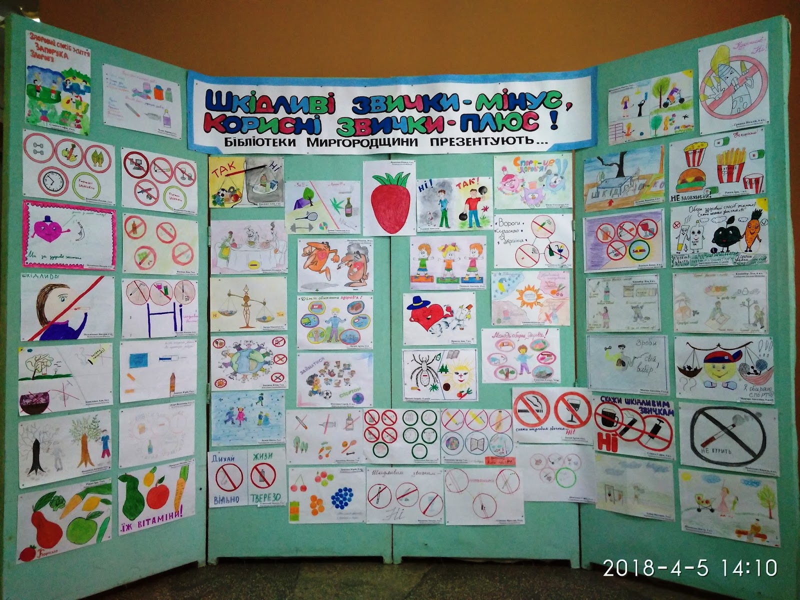 У фойє центральної районної бібліотеки до Всесвітнього Дня здоров’я розгорнуто виставку дитячих малюнків «Шкідливі звички – мінус, корисні звички – плюс». 46 юних користувачів з 18 бібліотек району взяли участь у виставковому проекті Миргородської ЦБС «Бібліотеки Миргородщини презентують…» Ангеліна Мовчан, Максим Тулинський, Едуард та Владислав Ганженко,Олександра Швець, Яна Фесенко, Настя Роменська,